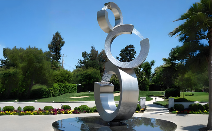不銹鋼材質賦予了雕塑現(xiàn)代感與時尚氣息,其光滑的表面能完美地反射周圍的環(huán)境與光影,當噴泉開啟,水流與光影相互交織,在不同的時段、不同的天氣條件下,呈現(xiàn)出千變萬化的視覺效果。白天,陽光灑在水面與雕塑上,閃耀著金色的光芒;夜晚,配合精心設計的燈光,噴泉雕塑又成為夜空中最璀璨的存在,為城市的夜景增添了一份浪漫與神秘。